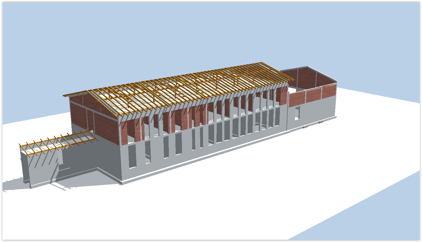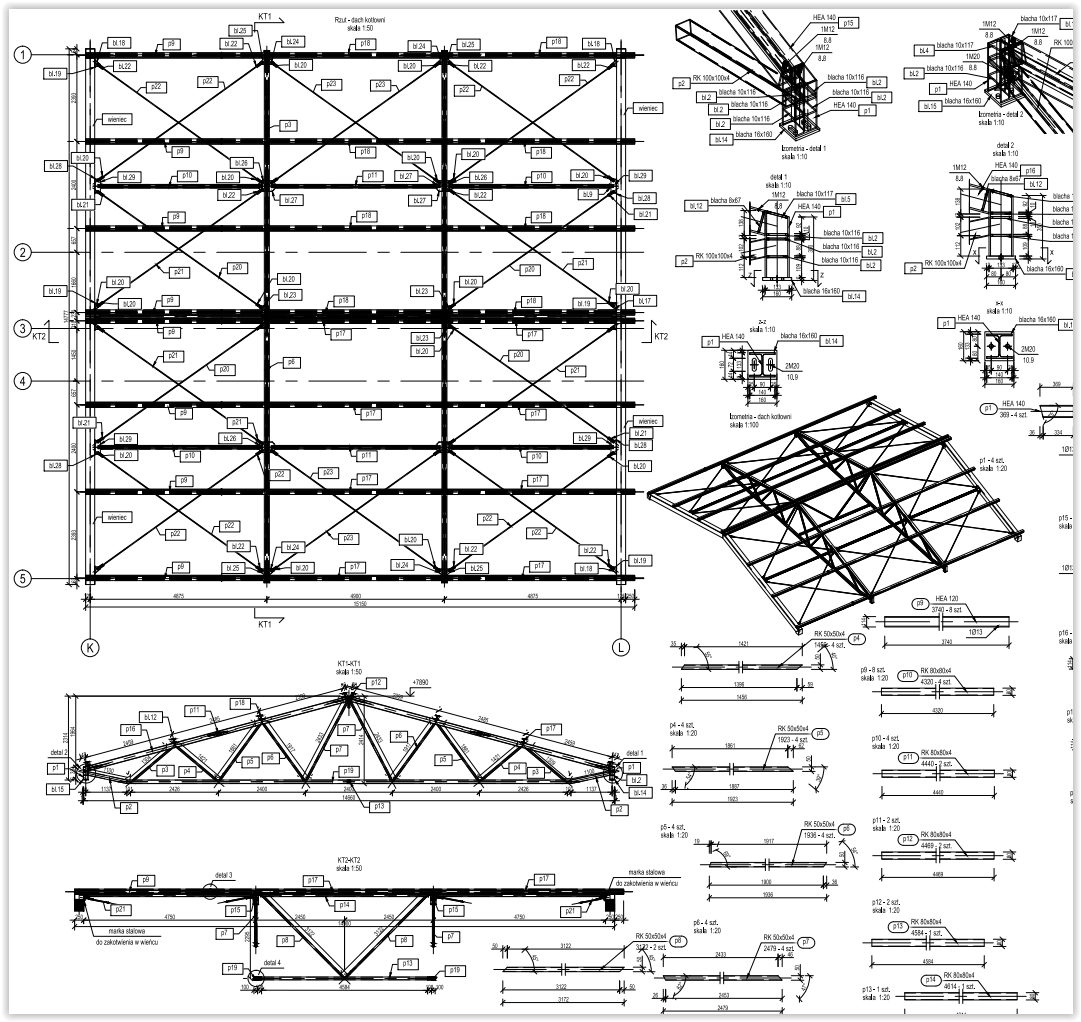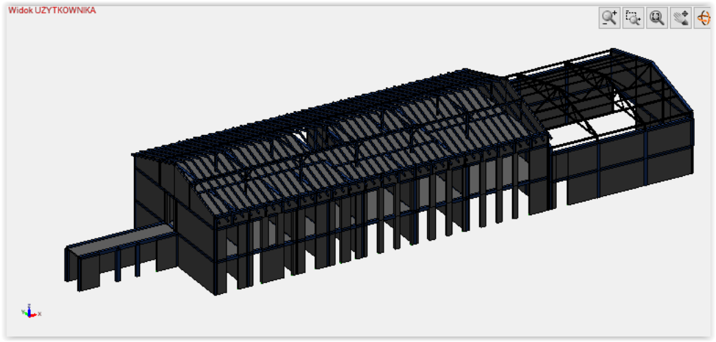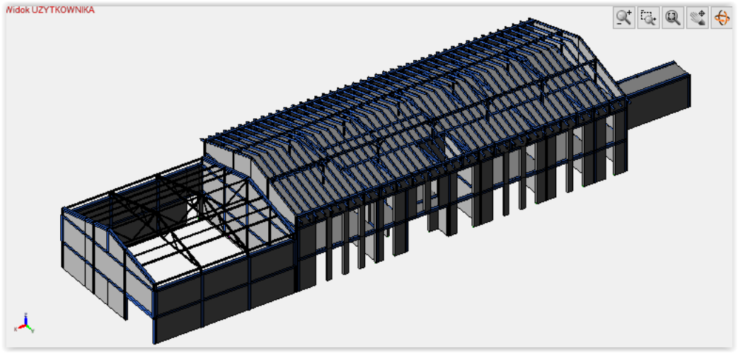 Projektujemy również hale stalowe oraz budynki administracyjno – biurowe. Jednymi z nich były obiekty służące wdrożeniu innowacyjnej technologii wytwarzania nawozów i dodatków paszowych oraz preparatów dedykowanych metodą odzysku. W skład budynków wchodziła hala o przeznaczeniu produkcyjno – magazynowym oraz budynek administracyjno – socjalny wraz z przewiązką łączącą oba obiekty. Układ konstrukcyjny budynku administracyjnego przyjęto głównie jako ścianowy. Ściany nośne zewnętrzne oraz wewnętrzne zaprojektowano jako murowane z pustaków ceramicznych. Lokalnie wprowadzono ściany / filary żelbetowe. Układ ścianowy uzupełniono belkami oraz trzpieniami żelbetowymi. Budynek złożony jest z części głównej o funkcji administracyjno – socjalnej oraz kotłowni zlokalizowanej po wschodniej stronie. Stropy nad parterem oraz I piętrem przewidziano w postaci żelbetowych płyt monolitycznych, wylewanych na budowie. Nad kotłownią konstrukcję zadaszenia przewidziano w postaci trójkątnej kratownicy stalowej wykonanej z elementów gorącowalcowanych. Nad pozostałą częścią budynku przewidziano więźbę drewnianą o konstrukcji płatwiowo – kleszczowej. Posadowienie w sposób bezpośredni w postaci żelbetowych ław i stóp fundamentowych. Hala produkcyjno – magazynowa natomiast to obiekt o układzie ram stalowych rozmieszczonych w rozstawie osiowym wynoszącym 6,0 m. Ramy zaprojektowano o węzłach sztywnych, zaś słupy wsparto na fundamentach w sposób przegubowy. Obiekt przewidziano o zróżnicowanej wysokości – boczne segmenty o wysokości maksymalnej wynoszącej ok. 12 m, segment środkowy natomiast o wysokości ok. 16 m oraz 20 m. Ramy główne zaprojektowano z kształtowników gorącowalcowanych o przekroju dwuteowym HEA oraz HEB. Pomiędzy ramami głównymi zaprojektowano słupy drugorzędne stanowiące konstrukcję wsporczą dla rygli ściennych oraz płyt warstwowych. Posadowienie bezpośrednie na żelbetowych stopach fundamentowych połączonych monolityczną, żelbetową belką podwalinową, na której wsparto słupy drugorzędne. Całość dokumentacji konstrukcyjnej wraz ze zbrojeniem poszczególnych elementów oraz detalami połączeń opracowaliśmy w modelu przestrzennym.