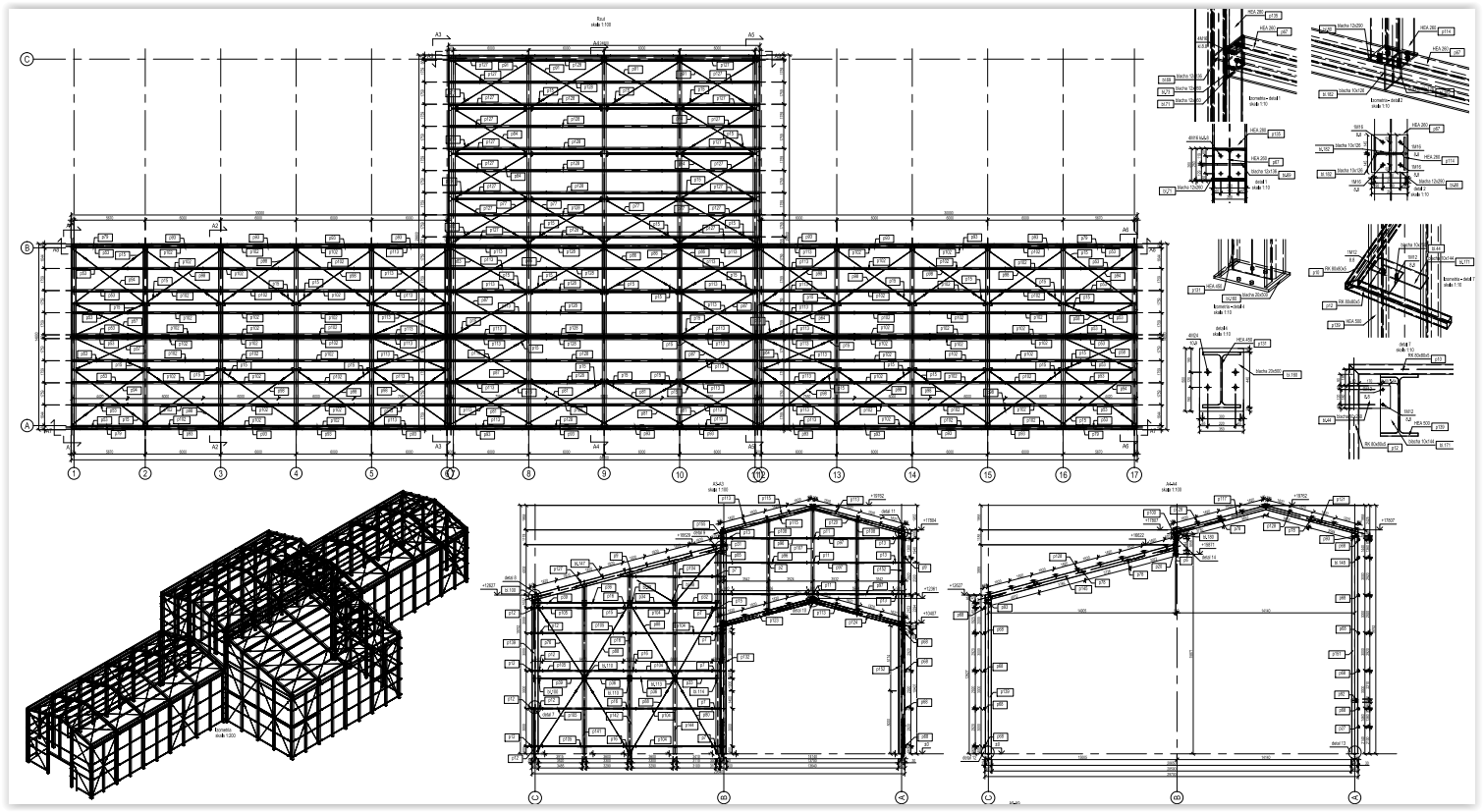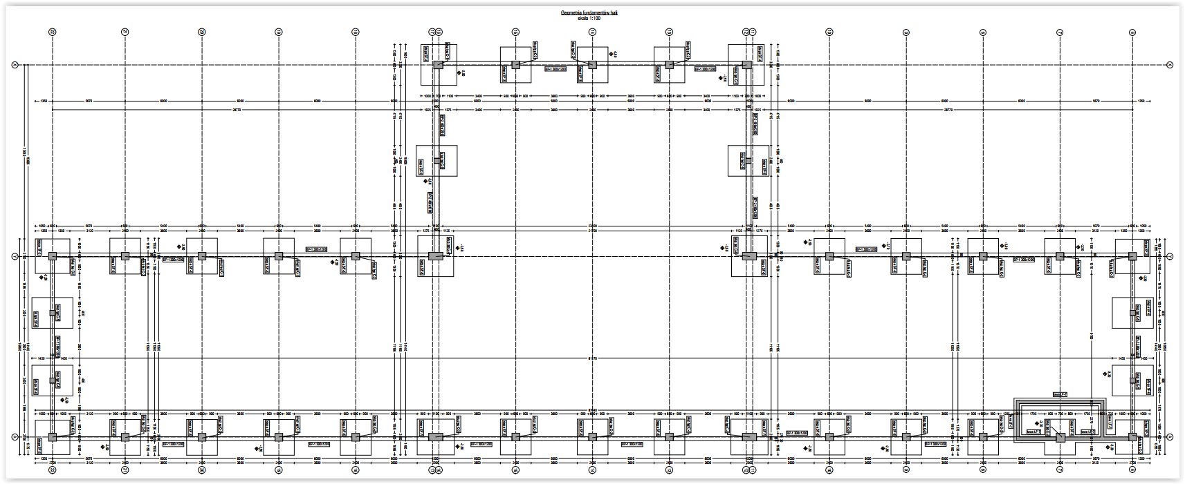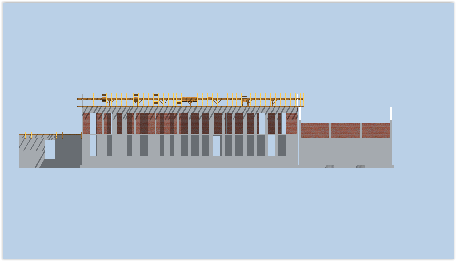 Projektujemy również hale stalowe oraz budynki administracyjno – biurowe. Jednymi z nich były obiekty służące wdrożeniu innowacyjnej technologii wytwarzania nawozów i dodatków paszowych oraz preparatów dedykowanych metodą odzysku. W skład budynków wchodziła hala o przeznaczeniu produkcyjno – magazynowym oraz budynek administracyjno – socjalny wraz z przewiązką łączącą oba obiekty. Układ konstrukcyjny budynku administracyjnego przyjęto głównie jako ścianowy. Ściany nośne zewnętrzne oraz wewnętrzne zaprojektowano jako murowane z pustaków ceramicznych. Lokalnie wprowadzono ściany / filary żelbetowe. Układ ścianowy uzupełniono belkami oraz trzpieniami żelbetowymi. Budynek złożony jest z części głównej o funkcji administracyjno – socjalnej oraz kotłowni zlokalizowanej po wschodniej stronie. Stropy nad parterem oraz I piętrem przewidziano w postaci żelbetowych płyt monolitycznych, wylewanych na budowie. Nad kotłownią konstrukcję zadaszenia przewidziano w postaci trójkątnej kratownicy stalowej wykonanej z elementów gorącowalcowanych. Nad pozostałą częścią budynku przewidziano więźbę drewnianą o konstrukcji płatwiowo – kleszczowej. Posadowienie w sposób bezpośredni w postaci żelbetowych ław i stóp fundamentowych. Hala produkcyjno – magazynowa natomiast to obiekt o układzie ram stalowych rozmieszczonych w rozstawie osiowym wynoszącym 6,0 m. Ramy zaprojektowano o węzłach sztywnych, zaś słupy wsparto na fundamentach w sposób przegubowy. Obiekt przewidziano o zróżnicowanej wysokości – boczne segmenty o wysokości maksymalnej wynoszącej ok. 12 m, segment środkowy natomiast o wysokości ok. 16 m oraz 20 m. Ramy główne zaprojektowano z kształtowników gorącowalcowanych o przekroju dwuteowym HEA oraz HEB. Pomiędzy ramami głównymi zaprojektowano słupy drugorzędne stanowiące konstrukcję wsporczą dla rygli ściennych oraz płyt warstwowych. Posadowienie bezpośrednie na żelbetowych stopach fundamentowych połączonych monolityczną, żelbetową belką podwalinową, na której wsparto słupy drugorzędne. Całość dokumentacji konstrukcyjnej wraz ze zbrojeniem poszczególnych elementów oraz detalami połączeń opracowaliśmy w modelu przestrzennym.