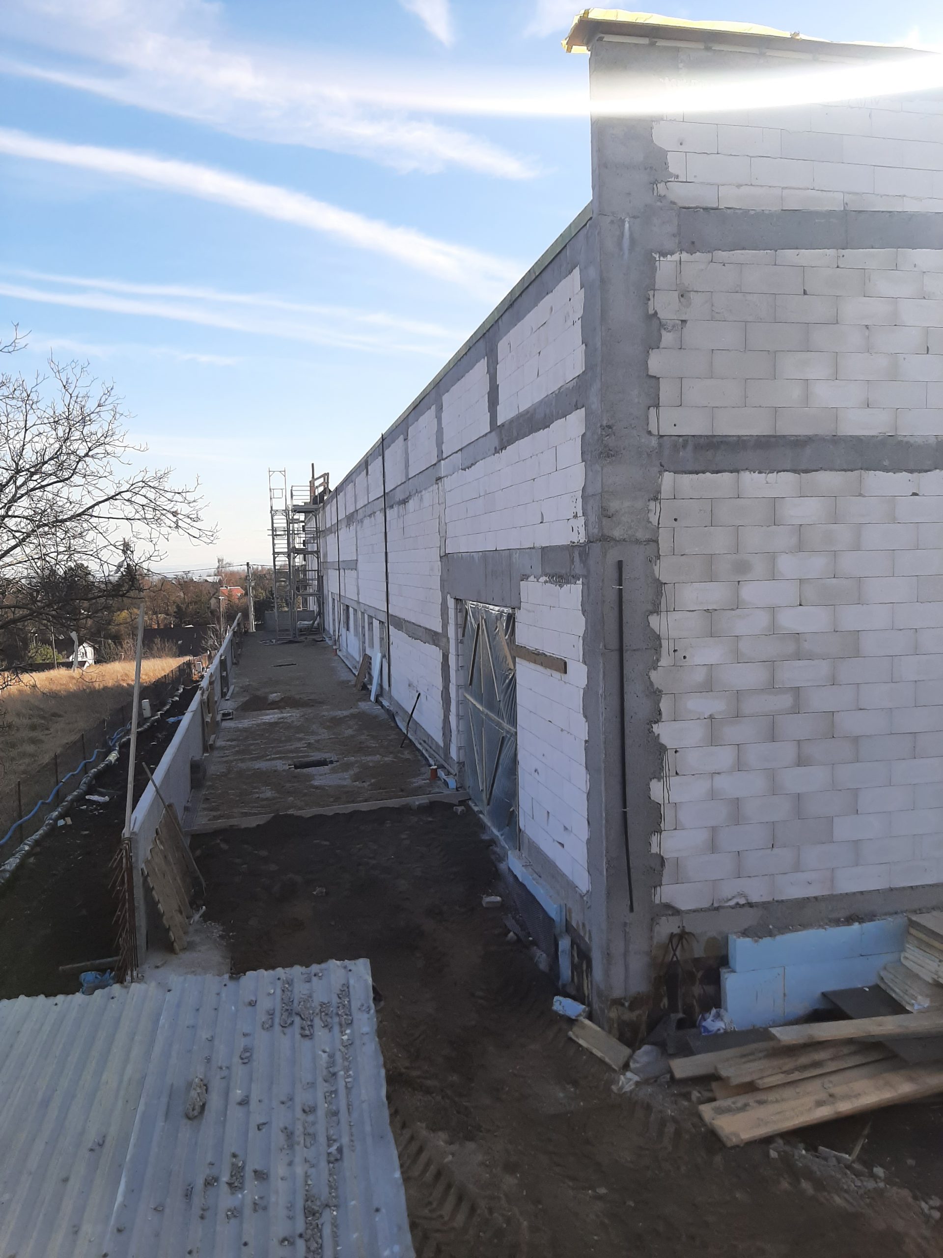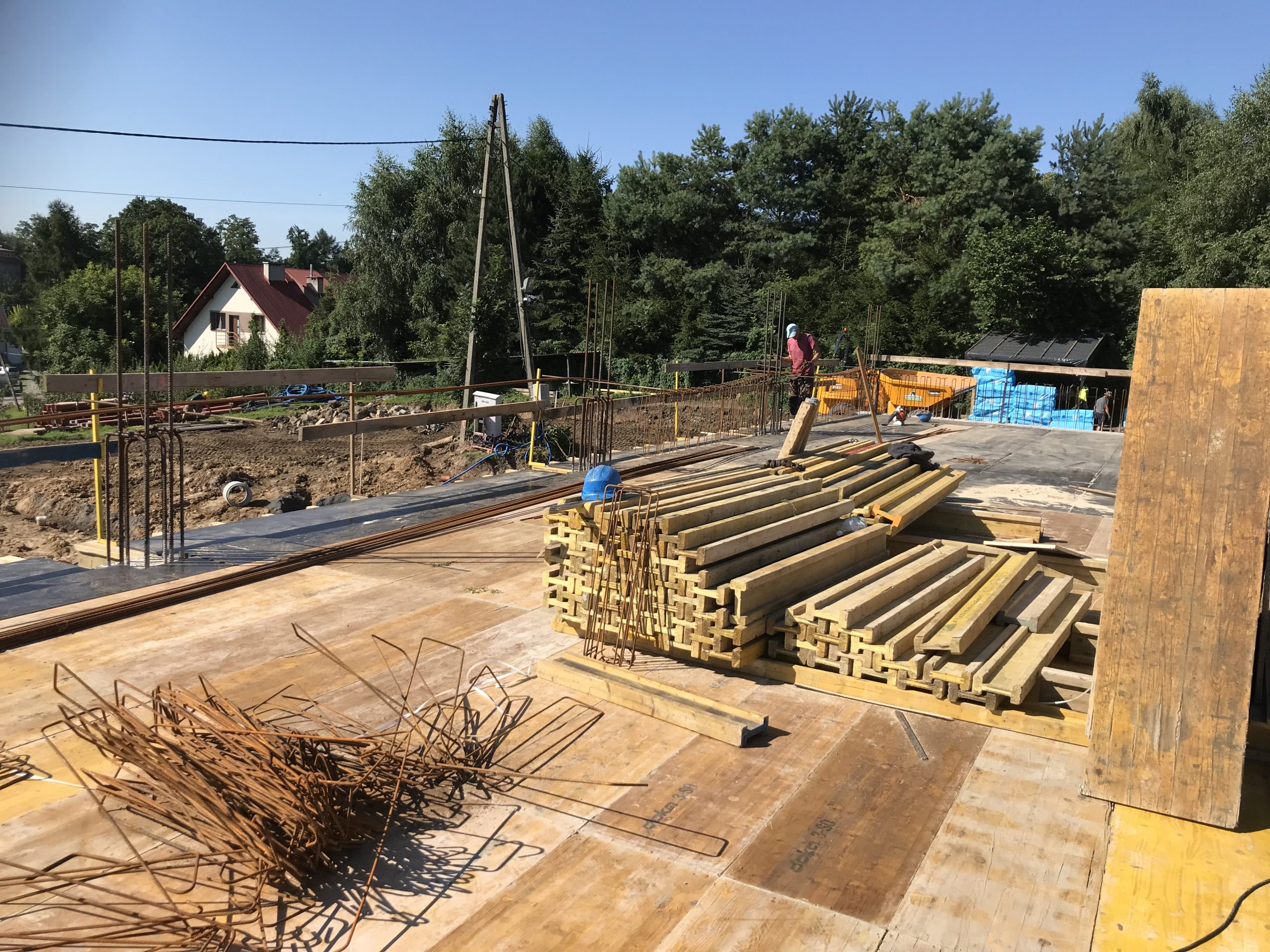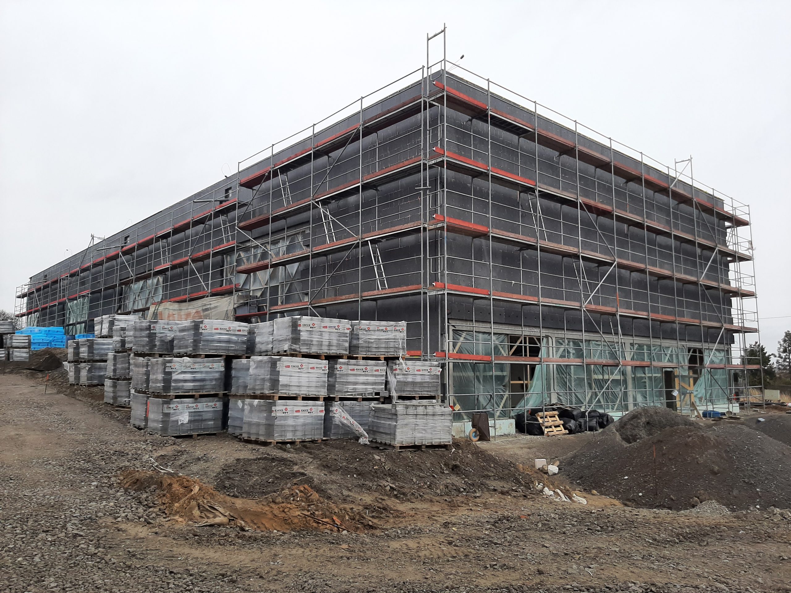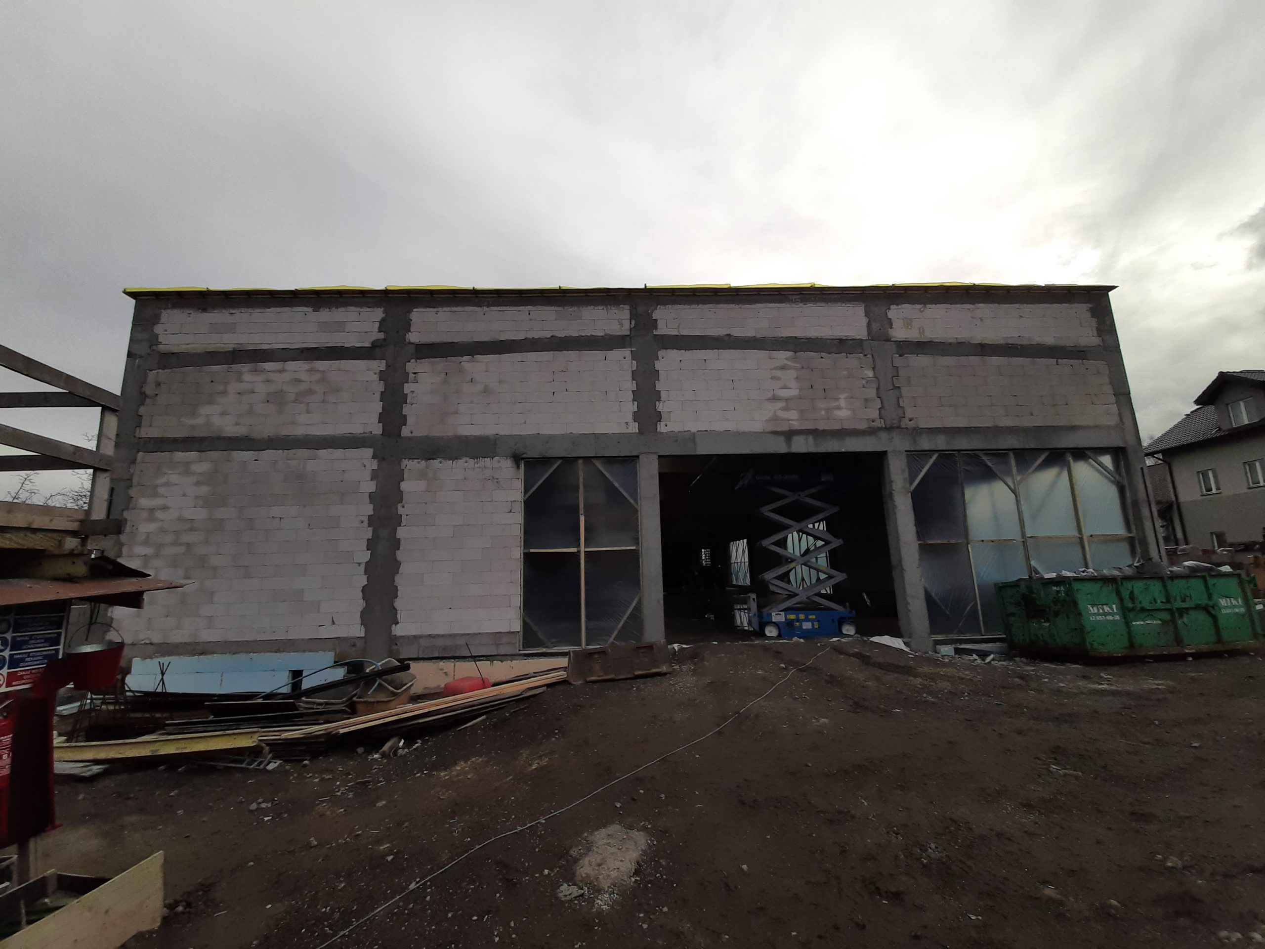 Wykonaliśmy również dokumentacje dla inwestycji zlokalizowanej w podkrakowskim Kocmyrzowie. Budynek ten jest obiektem w większości parterowym za wyjątkiem strefy wejścia, gdzie ze względu na ukształtowanie terenu wprowadzono drugą kondygnację. Układ konstrukcyjny projektowanego budynku przyjęto jako ramowy w części parterowej oraz jako ścianowy w strefie wejściowej. Ramy zaprojektowano w rozstawie osiowym wynoszącym 7,50 m. Ramy zaprojektowano jako słupy żelbetowe z opartym na nich dźwigarem trapezowym z drewna klejonego. Przekrycie w postaci lekkiej. Przekrycie budynku przewidziano w postaci dwuspadowego dachu, którego spadek wykształtowany jest przez geometrię dźwigara. Wyzwaniem okazało się posadowienie obiektu. Wspólnie z Generalnym Wykonawcą i Geotechnikiem zostały przyjęte rozwiązania w postaci stabilizacji podłoża do określonej przez nas w dokumentacji minimalnej nośności. Ponadto w trakcie budowy zrezygnowano z prefabrykacji elementów żelbetowych nadziemia, a także płyt warstwowych na rzecz konstrukcji tradycyjnej w postaci słupów i belek żelbetowych, monolitycznym oraz ścian murowanych. Oprócz projektu budowlanego oraz wykonawczego, pełnimy nadzór autorski na tej inwestycji.
