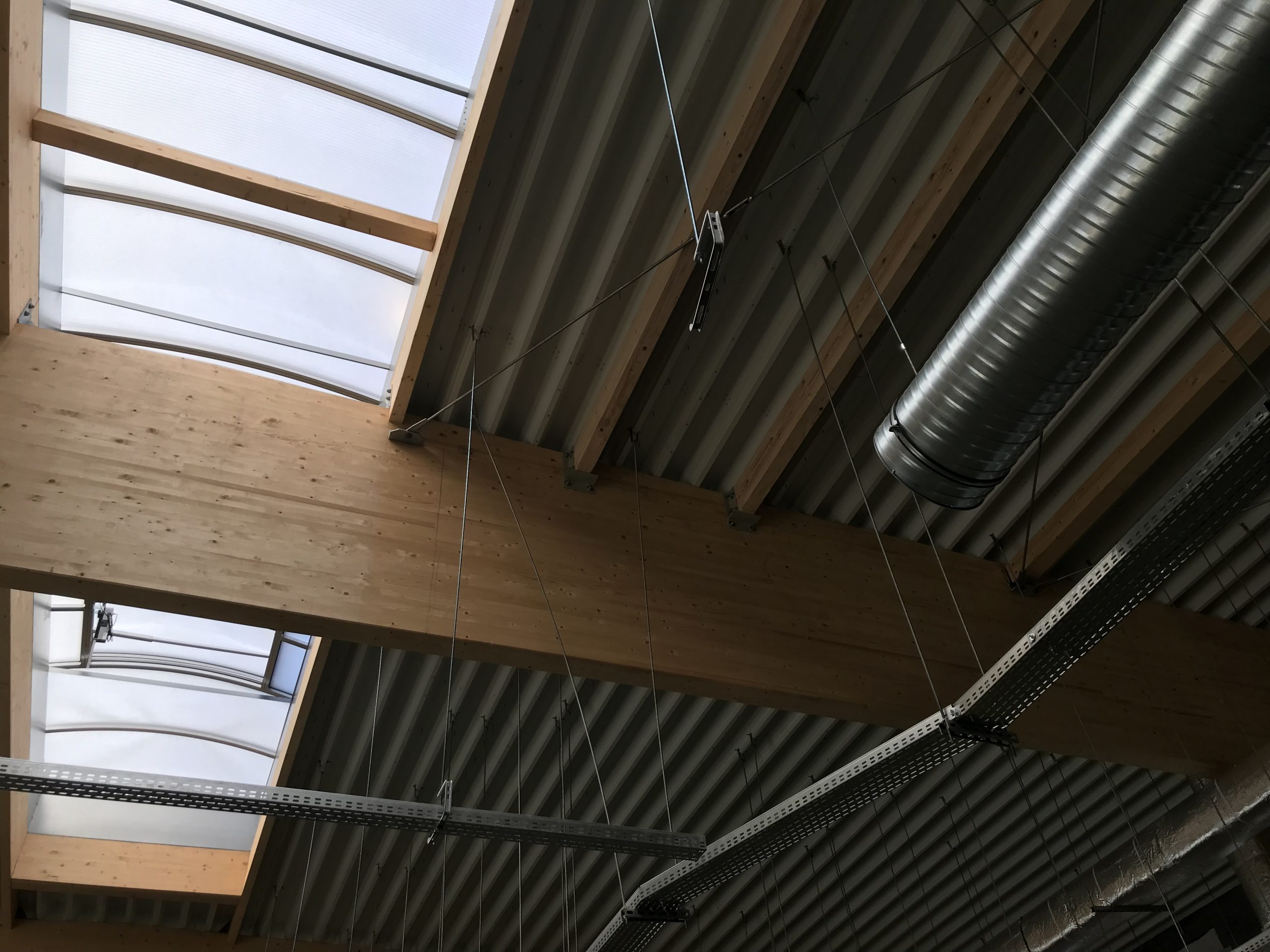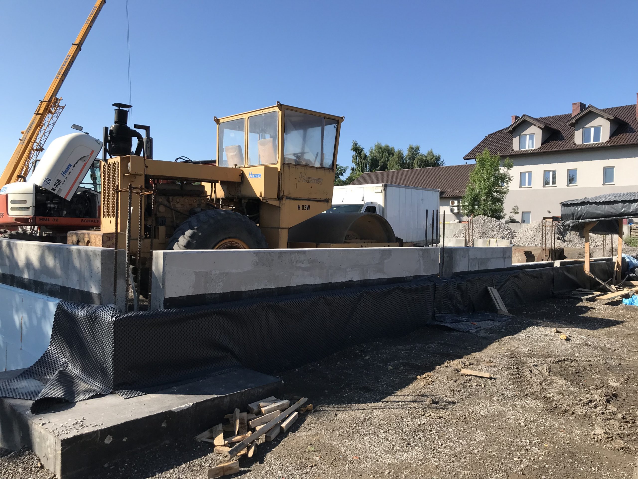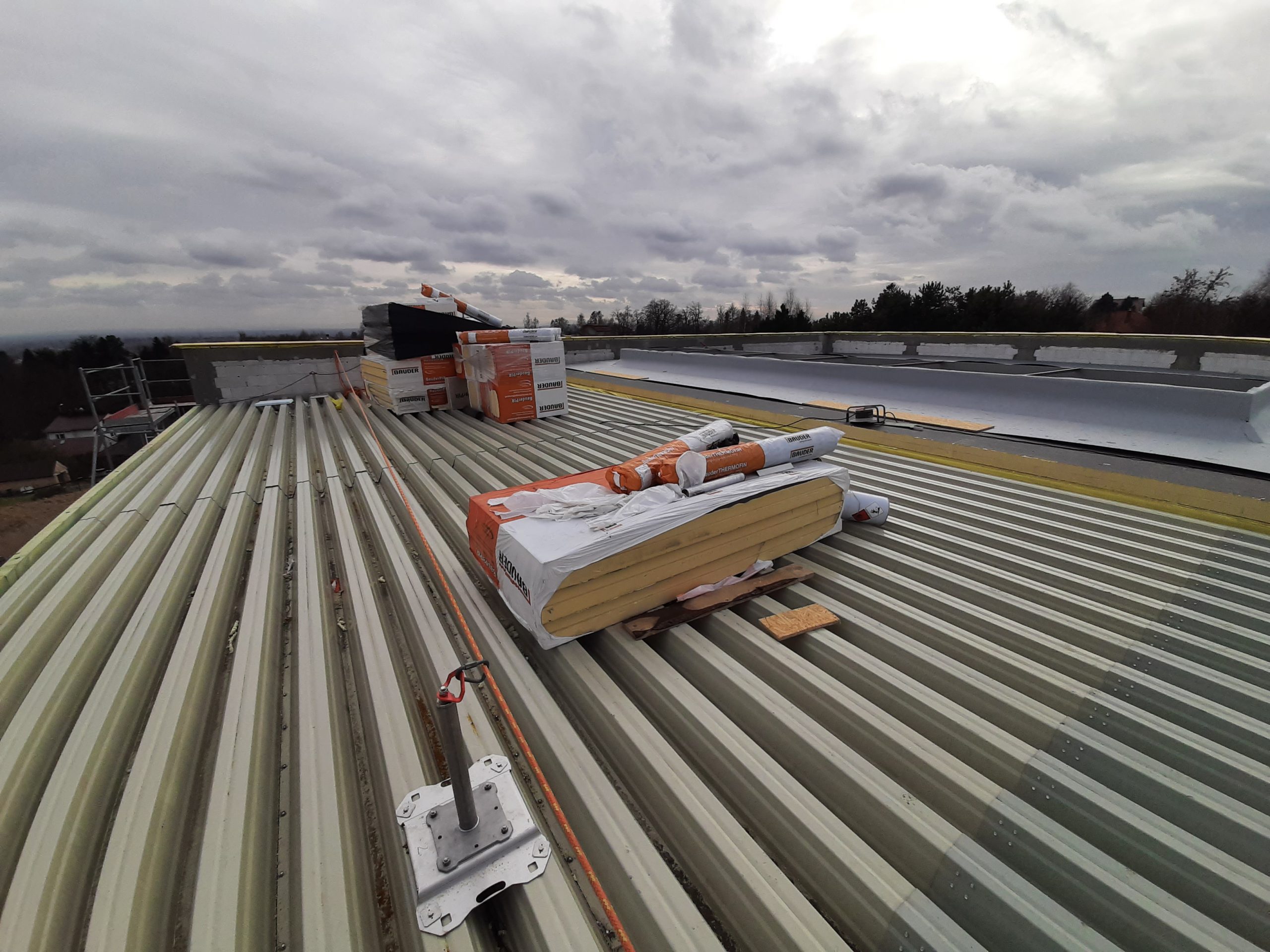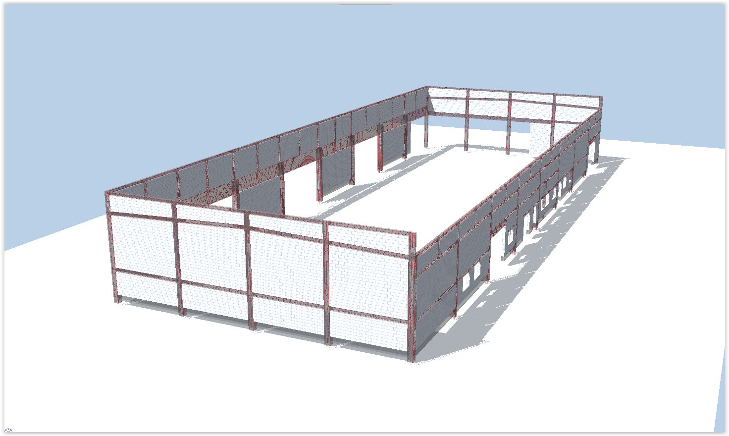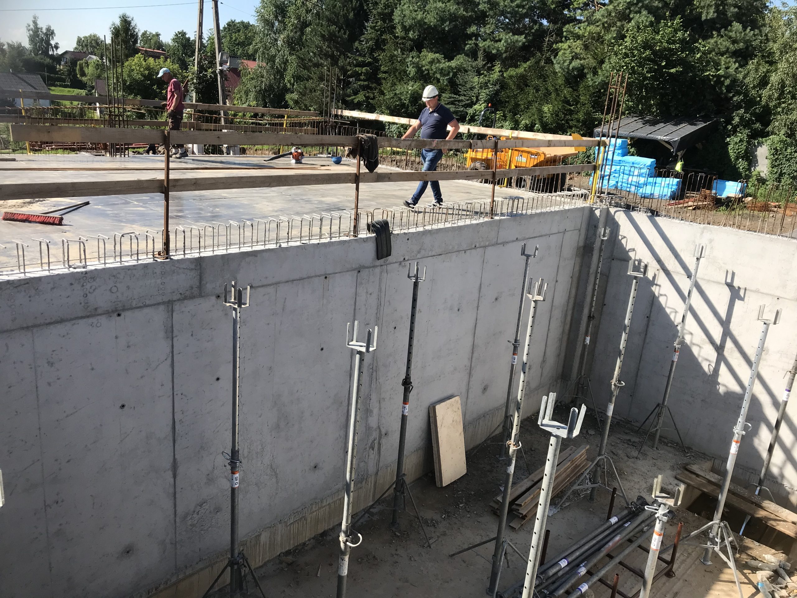 Wykonaliśmy również dokumentacje dla inwestycji zlokalizowanej w podkrakowskim Kocmyrzowie. Budynek ten jest obiektem w większości parterowym za wyjątkiem strefy wejścia, gdzie ze względu na ukształtowanie terenu wprowadzono drugą kondygnację. Układ konstrukcyjny projektowanego budynku przyjęto jako ramowy w części parterowej oraz jako ścianowy w strefie wejściowej. Ramy zaprojektowano w rozstawie osiowym wynoszącym 7,50 m. Ramy zaprojektowano jako słupy żelbetowe z opartym na nich dźwigarem trapezowym z drewna klejonego. Przekrycie w postaci lekkiej. Przekrycie budynku przewidziano w postaci dwuspadowego dachu, którego spadek wykształtowany jest przez geometrię dźwigara. Wyzwaniem okazało się posadowienie obiektu. Wspólnie z Generalnym Wykonawcą i Geotechnikiem zostały przyjęte rozwiązania w postaci stabilizacji podłoża do określonej przez nas w dokumentacji minimalnej nośności. Ponadto w trakcie budowy zrezygnowano z prefabrykacji elementów żelbetowych nadziemia, a także płyt warstwowych na rzecz konstrukcji tradycyjnej w postaci słupów i belek żelbetowych, monolitycznym oraz ścian murowanych. Oprócz projektu budowlanego oraz wykonawczego, pełnimy nadzór autorski na tej inwestycji.