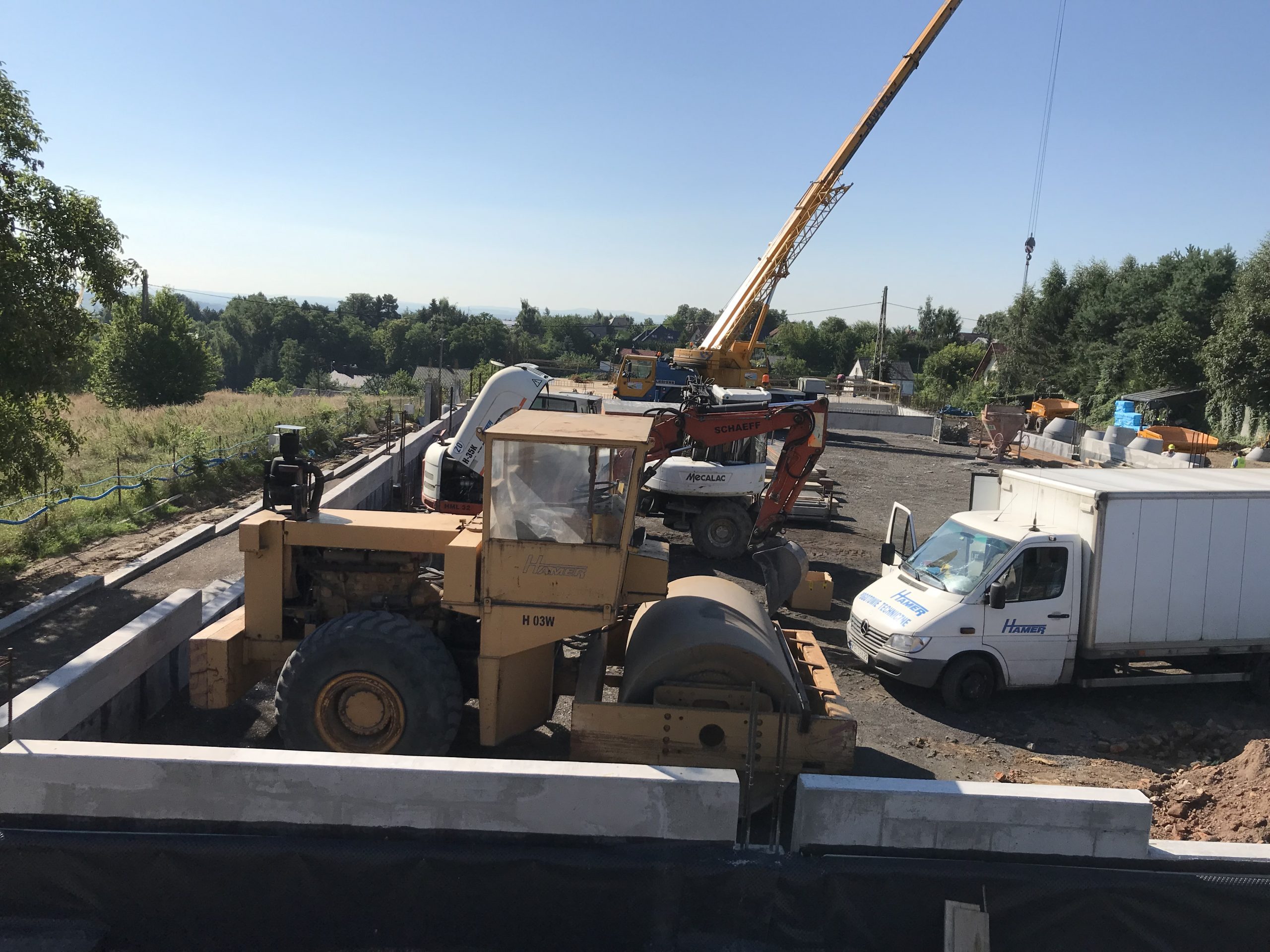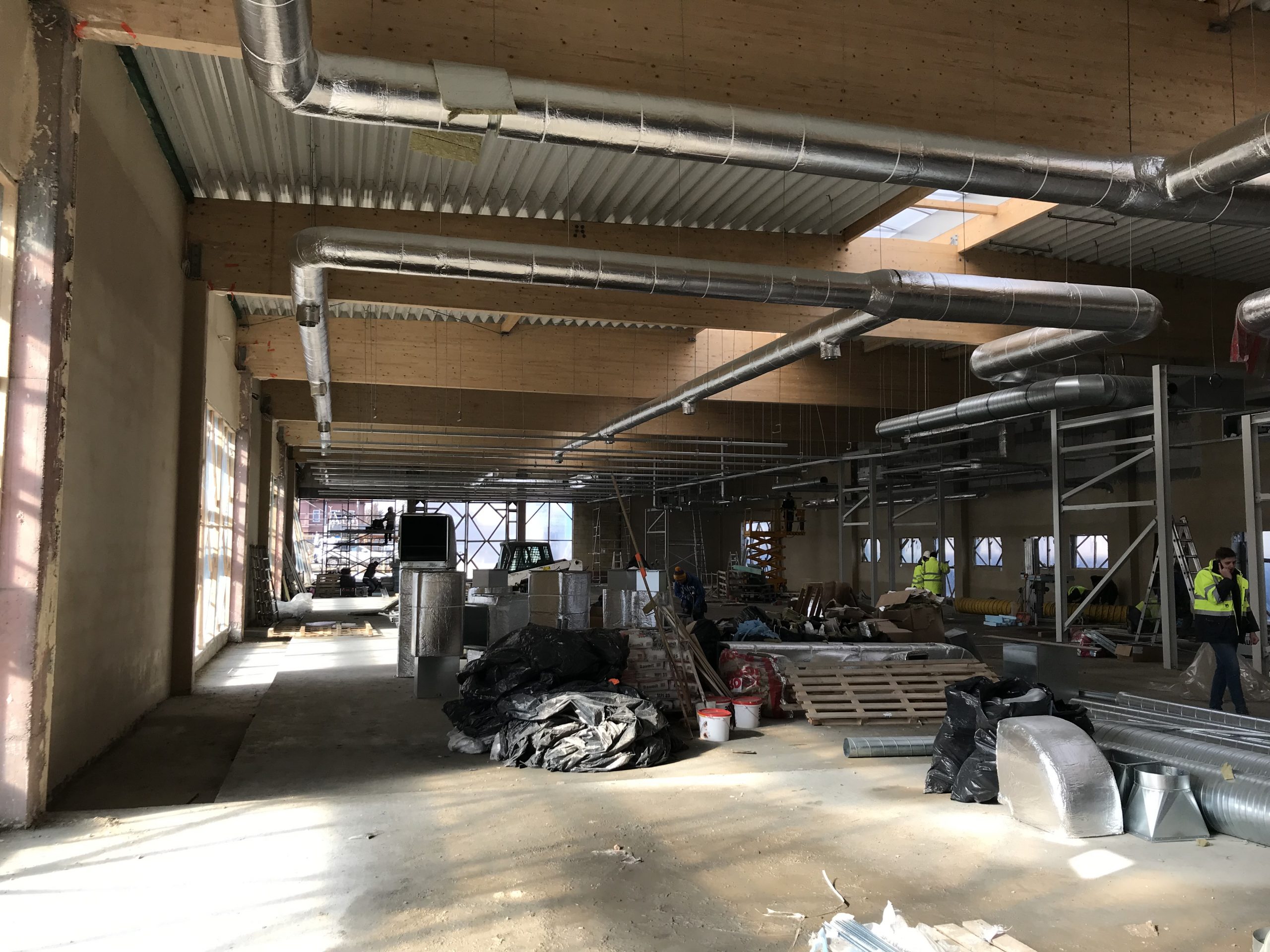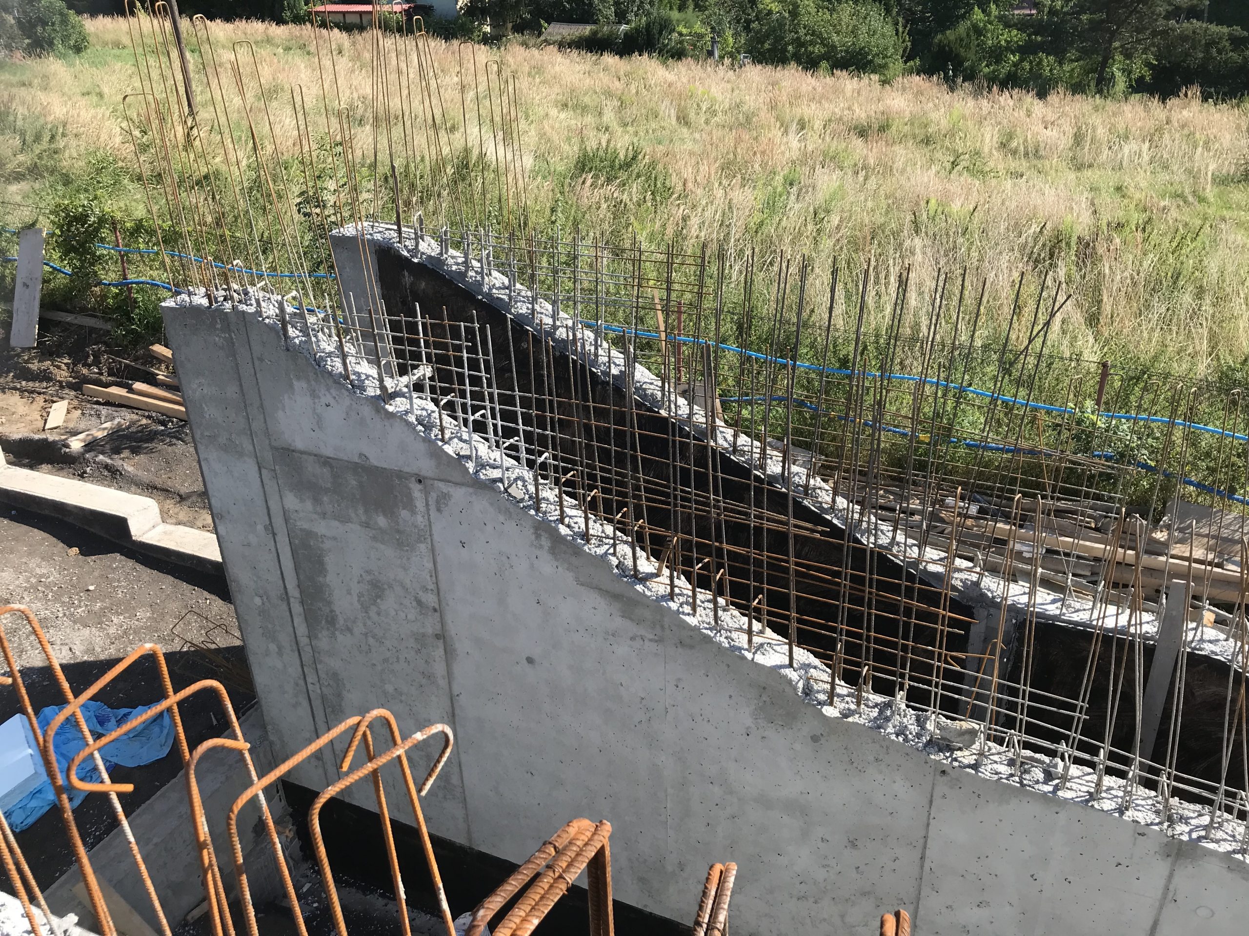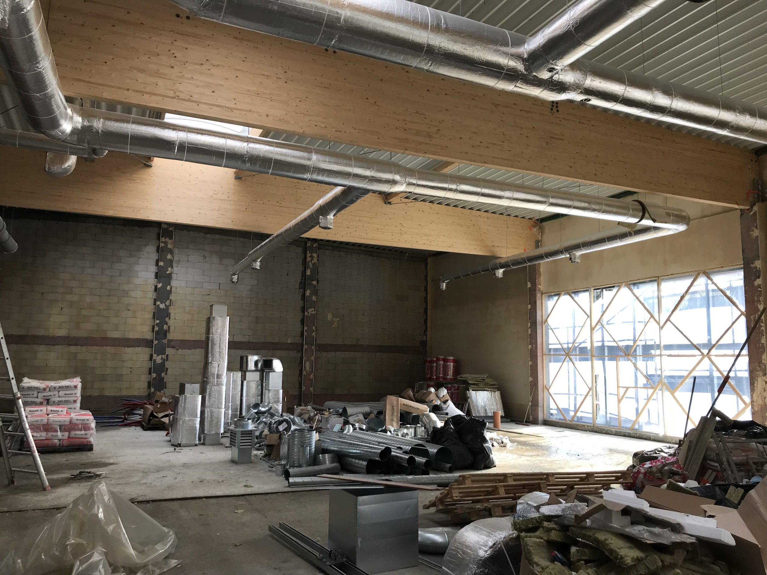 Wykonaliśmy również dokumentacje dla inwestycji zlokalizowanej w podkrakowskim Kocmyrzowie. Budynek ten jest obiektem w większości parterowym za wyjątkiem strefy wejścia, gdzie ze względu na ukształtowanie terenu wprowadzono drugą kondygnację. Układ konstrukcyjny projektowanego budynku przyjęto jako ramowy w części parterowej oraz jako ścianowy w strefie wejściowej. Ramy zaprojektowano w rozstawie osiowym wynoszącym 7,50 m. Ramy zaprojektowano jako słupy żelbetowe z opartym na nich dźwigarem trapezowym z drewna klejonego. Przekrycie w postaci lekkiej. Przekrycie budynku przewidziano w postaci dwuspadowego dachu, którego spadek wykształtowany jest przez geometrię dźwigara. Wyzwaniem okazało się posadowienie obiektu. Wspólnie z Generalnym Wykonawcą i Geotechnikiem zostały przyjęte rozwiązania w postaci stabilizacji podłoża do określonej przez nas w dokumentacji minimalnej nośności. Ponadto w trakcie budowy zrezygnowano z prefabrykacji elementów żelbetowych nadziemia, a także płyt warstwowych na rzecz konstrukcji tradycyjnej w postaci słupów i belek żelbetowych, monolitycznym oraz ścian murowanych. Oprócz projektu budowlanego oraz wykonawczego, pełnimy nadzór autorski na tej inwestycji.