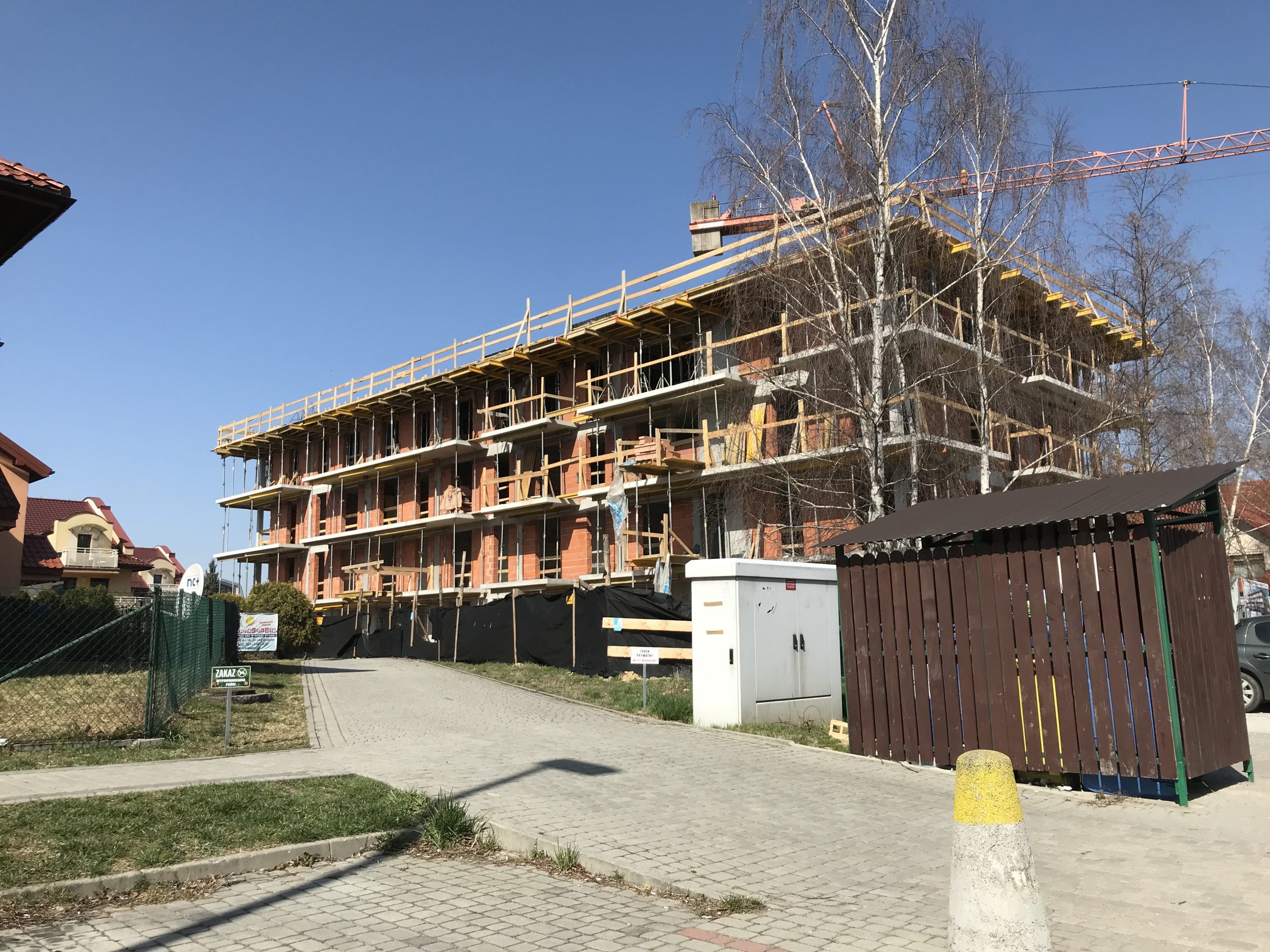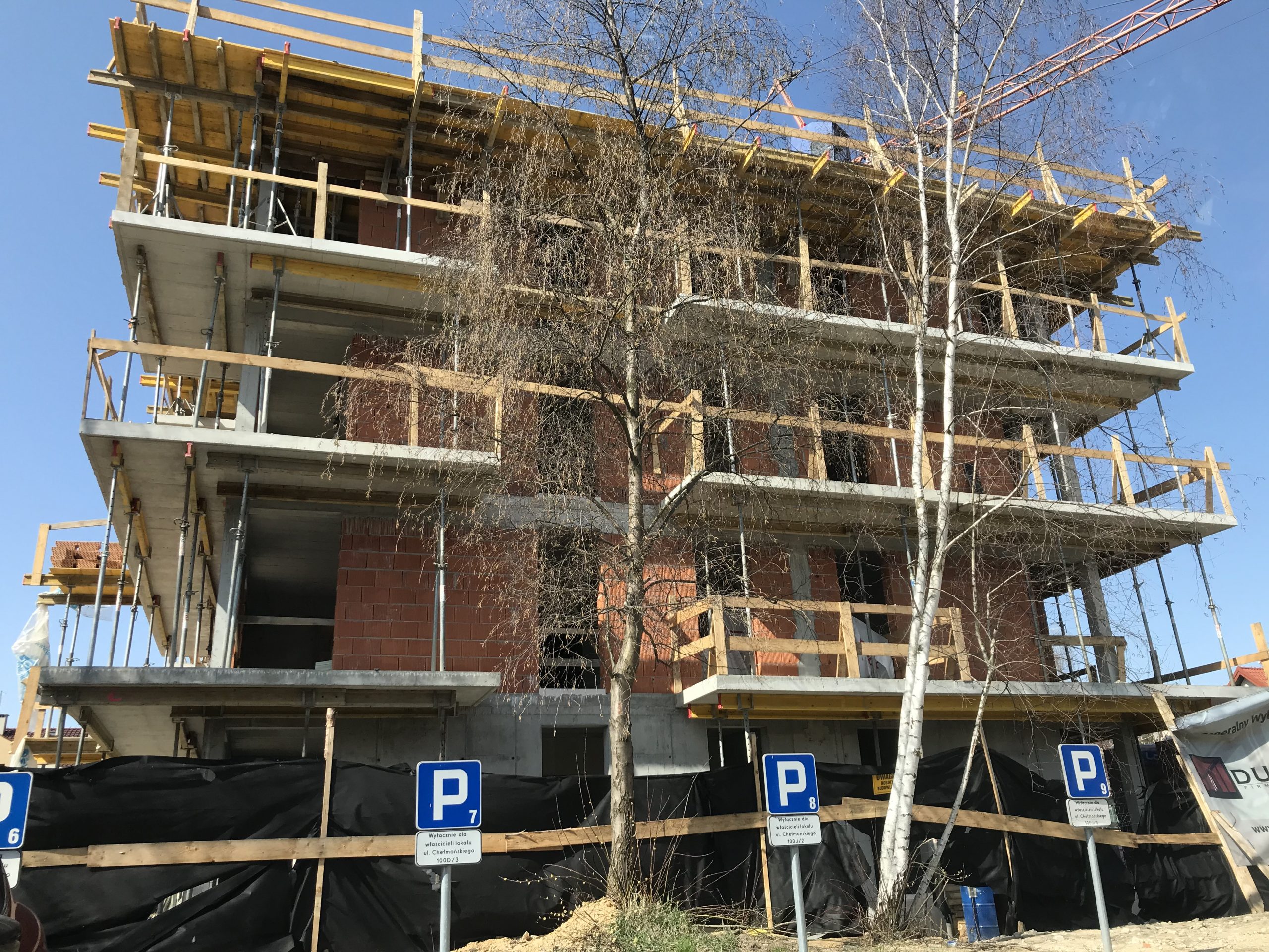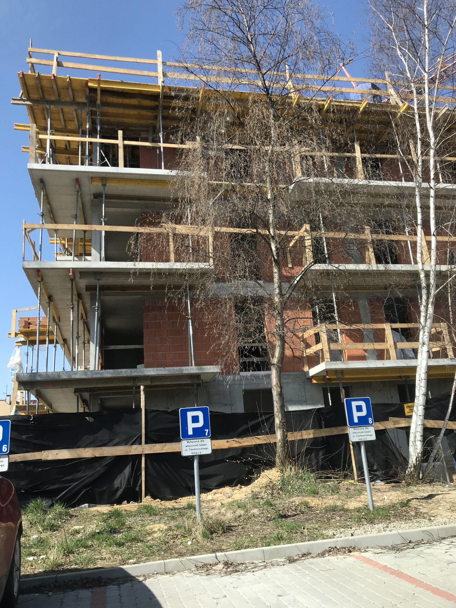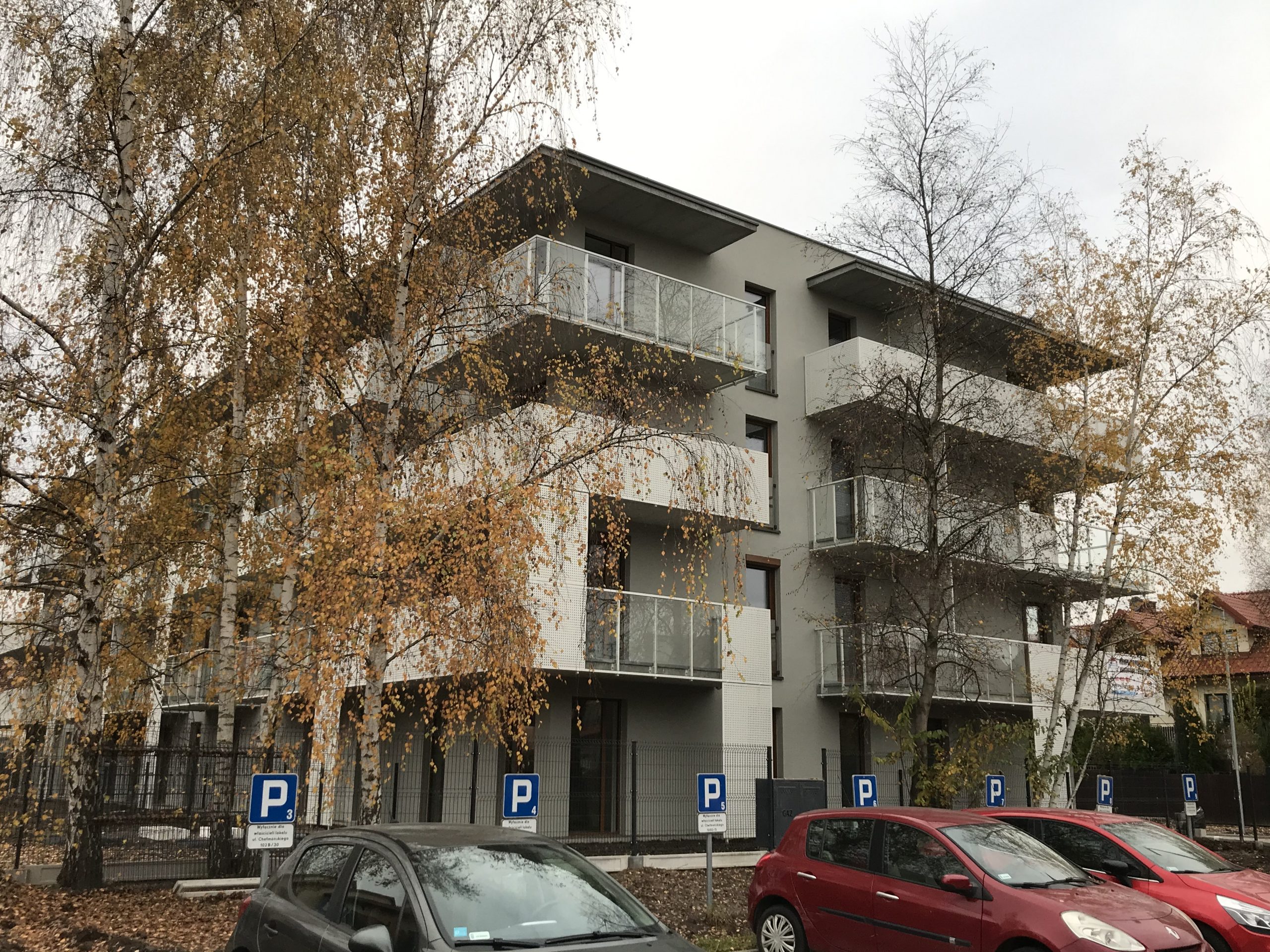 Kolejnym zrealizowanym już budynkiem wielorodzinnym, dla którego wykonywaliśmy dokumentację konstrukcyjną, jest obiekt zlokalizowany przy ulicy Chełmońskiego w Krakowie. Układ konstrukcyjny przyjęto głównie jako poprzeczny. Ściany nośne zewnętrzne zaprojektowano jako żelbetowe w poziomie garażu oraz parteru. Na parterze pełnią one funkcję tarcz. Na wyższych kondygnacjach ściany w technologii tradycyjnej jako murowane z pustaków ceramicznych. Układ ścianowy uzupełniono belkami oraz trzpieniami żelbetowymi. Ponadto układ nośny uzupełniono układem poprzecznych żelbetowych ram zlokalizowanych głównie w ścianach wydzielających pomieszczenia mieszkalne. Wraz z tarczami, trzpieniami oraz trzonem komunikacyjnym zapewniają one sztywność przestrzenną obiektu. W części podziemnej obrys budynku ulega powiększeniu. Stropy w postaci żelbetowych płyt monolitycznych, wylewanych na budowie. Przekrycie obiektu w postaci płaskiego stropodachu. Posadowienie w sposób bezpośredni na żelbetowej płycie fundamentowej.
